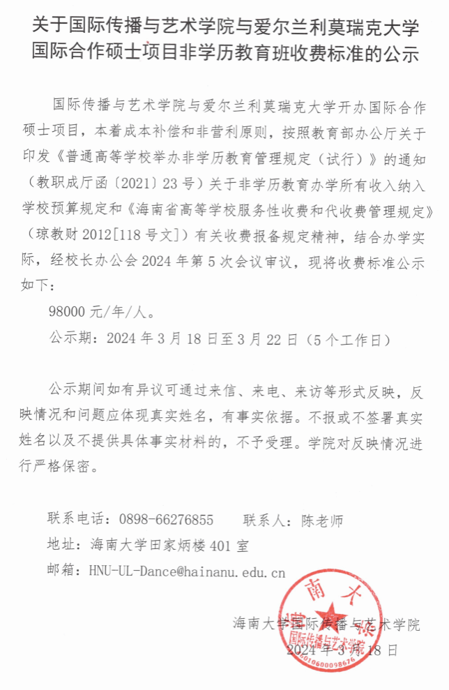 关于350vip浦京集团官网与爱尔兰利莫瑞克大学国际合作硕士项目非学历教育班收费标准的公示