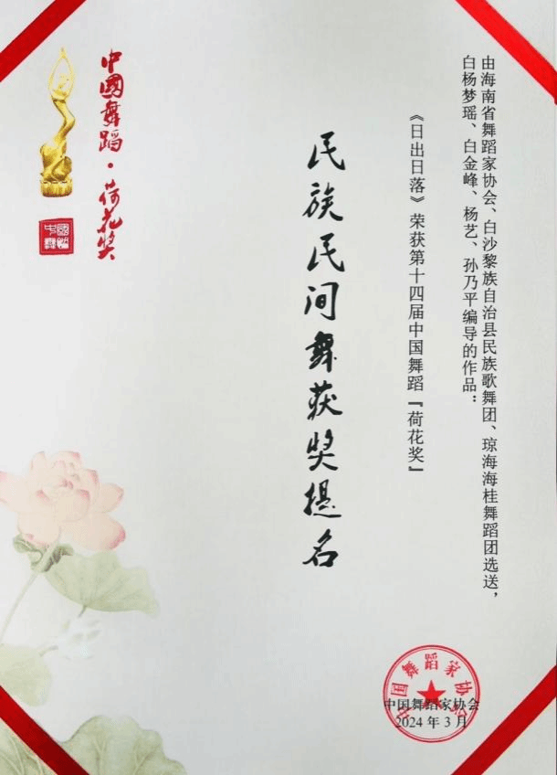 2023年10月26日至28日,第十四届中国舞蹈“荷花奖”民族民间舞评奖终评在山东济南举行,由浦京集团官网师生团队编创表演的舞蹈作品《日出日落》,荣获第十四届中国舞蹈“荷花奖”民族民间舞提名奖,是本届“荷花奖”民族民间舞评奖终评中唯一一支来自海南的黎族舞蹈。