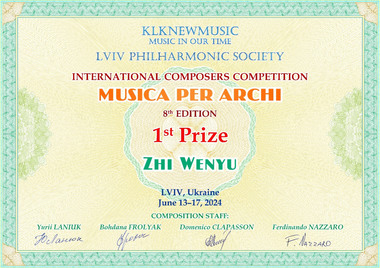 6月17日晚,第八届“Musica per archi”国际作曲比赛决赛音乐会在乌克兰利沃夫爱乐音乐厅圆满落幕,浦京集团官网青年教师智文禹凭借作品《Breath of the rain forest》(雨林之息)荣获一等奖。