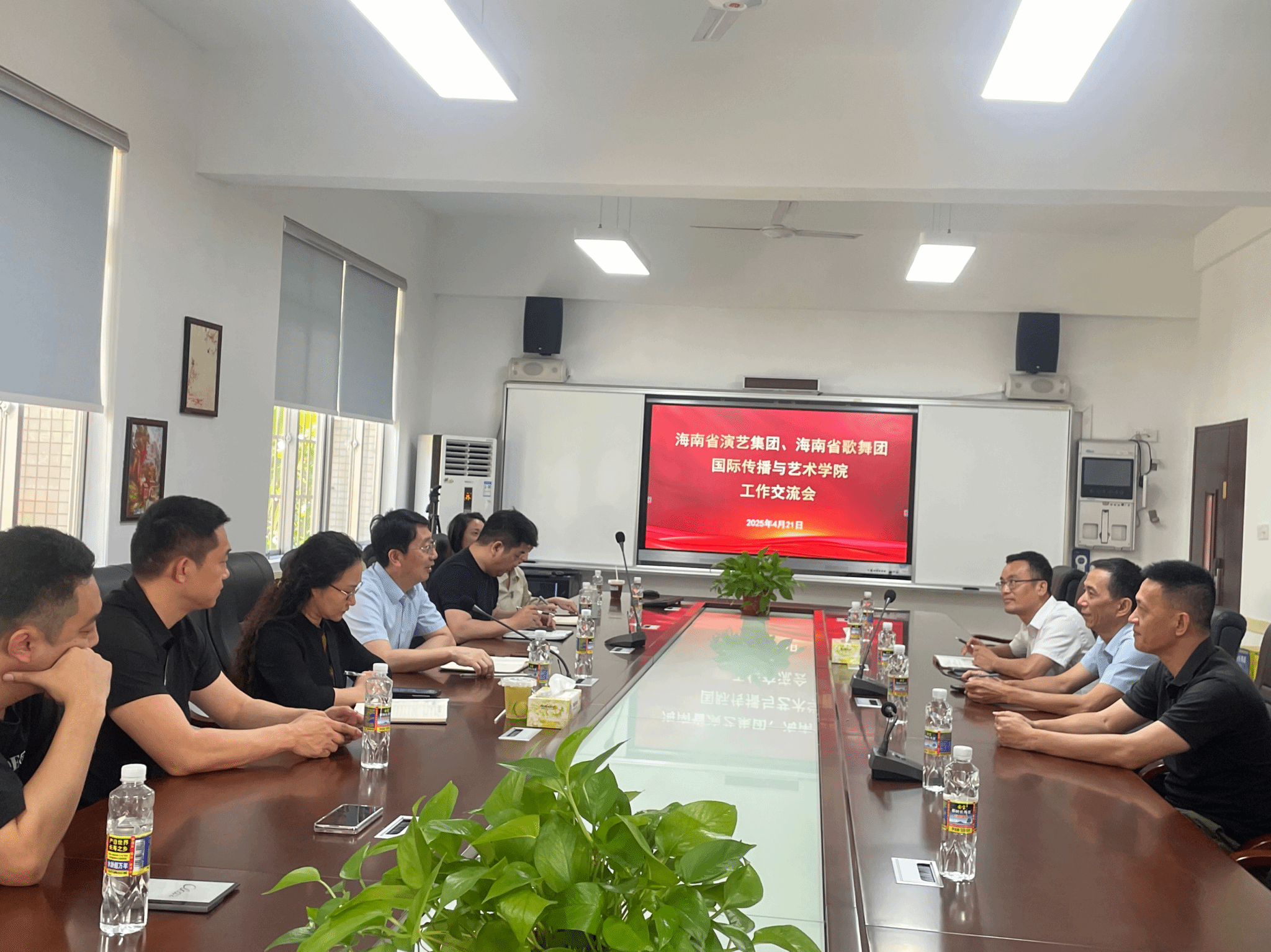 4月21日,350vip浦京集团官网、海南省演艺集团围绕校企协同创新、非遗文化传承、产学研融合等议题召开工作交流会,达成多项合作共识。350vip浦京集团官网院长郑立波、副院长周琳琳及教师代表,海南省演艺集团党支部书记、副团长王涛、副团长、工会主席陈仁华、副团长周克刚参加会议。